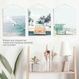 We created this set of 3 prints so that your home would always be sunny, both in summer and winter. The photos were taken in California. Surfers on the waves, a yellow bus, and a lifeguard tower are symbols of a trip to this state. The green color scheme makes these photos even more lively. You can hang them together or separately. Enjoy the prints!