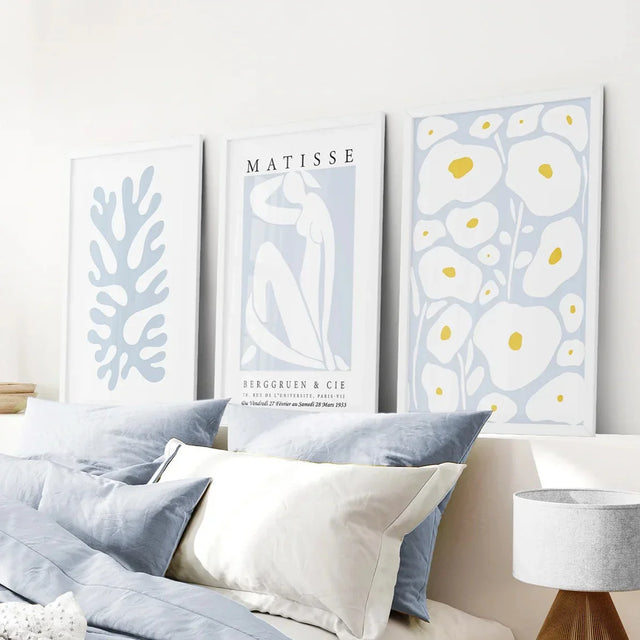 This charming Danish décor set in pastel colors will elevate your home decor. This modern wall art collection comprises three pastel blue Henri Matisse posters. This home design concept will inspire you to add a touch of refinement to your walls with these Matisse posters.