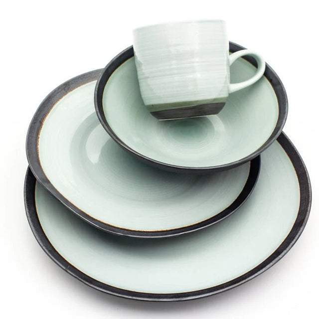 Let the simplicity of the Diana Collection set the stage for effortless elegance. With its tranquil celadon glaze and organic dark metallic rim, each piece evokes the look of hand-forged craftsmanship while maintaining the durability and convenience of porcelain. Designed for modern living, this set is both microwave and dishwasher safe—ideal for everyday meals and special gatherings alike.