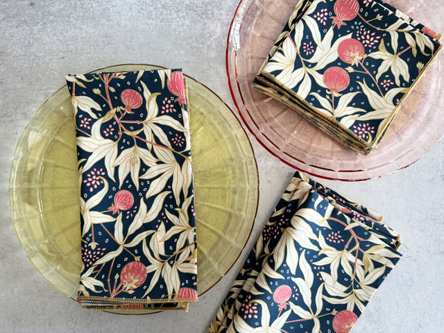 We love these napkins with a navy blue background, pretty pinks and hints of honey.
