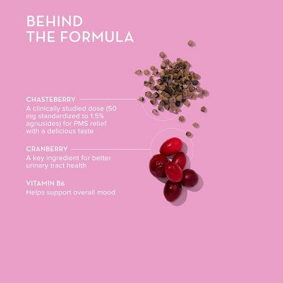 HUM Nutrition SOS PMS Gummies are made with standardized chasteberry extract, the fruit of the Vite agnus castus, for PMS relief with delicious taste.* A clinically studied dose of agnusides from chasteberry extract provides PMS symptom relief (including hormonal acne, bloating, mood swings, discomfort and breast tenderness), with cranberry to supports urinary tract health and vitamin B6 to help suport mood.*