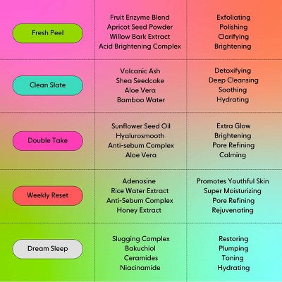 LOOPS Exclusive Variety Pack meets all your moment-based skincare needs. This core collection features our signature Koreran hydrogel masks: Fresh Peel Resurfacing, Double Take Glow Mask, Clean Slate Detoxifying Mask, Dream Sleep Nighttime Slugging Mask, and Weekly Reset Rejuvenating Mask. Designed for specific moments in one’s life, every mask has 4 key ingredients that ladder up to 4 key benefits so you know exactly what’s in it and what it’s doing for you.