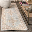 Three diamond-shaped medallions in the center of this design recall ancient geometric tribal rugs.