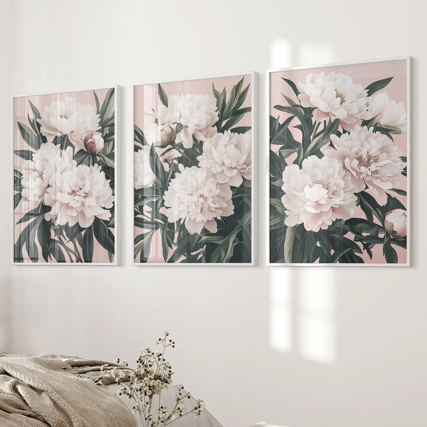 Peonies Flowers Wall Art Set of 3. Pink and Green Decor