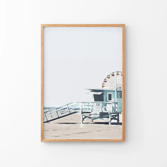 Santa Monica Beach is a prime example of Southern California's famous beaches. This photo depicts the main attraction of this beach, the Ferris wheel. This bright summer poster is perfect for a nursery.