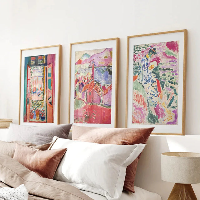 Enhance your space with this set of three prints of Matisse's breathtaking watercolor landscapes. These large wall art pieces are ideal for creating an exhibition-style atmosphere in your living room or bedroom. This wonderful wall art set displays Matisse's distinct style and love of nature. Use the set together to create a unified aesthetic, or combine with other pieces to enhance your room.