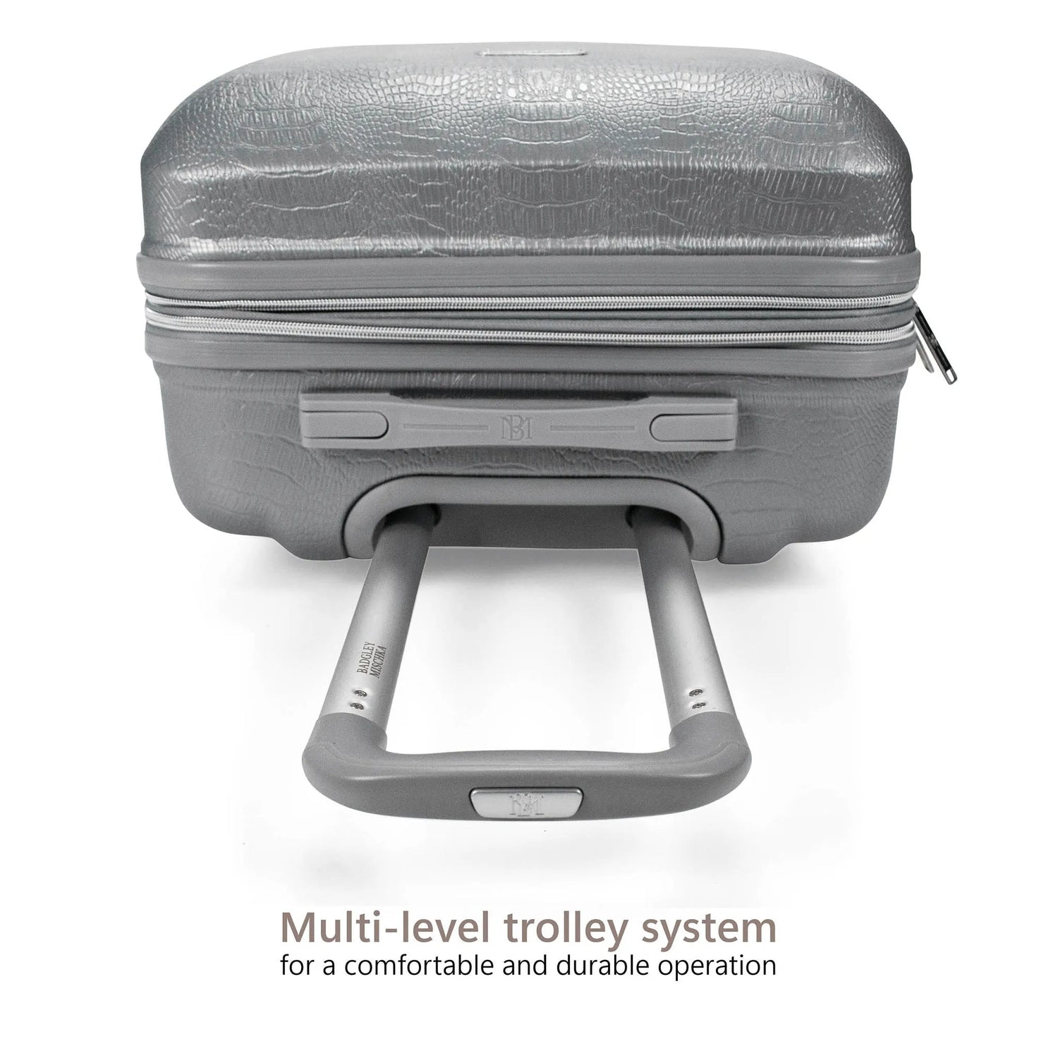 Introducing the Snakeskin 3-Piece expandable luggage set by Badgley Mischka. Keep your travels stylish and secure with this stunning set. Perfect for short trips or extended stays, this sturdy set includes three pieces of durable luggage that can accommodate all your belongings while keeping them safe. Featuring a sleek snakeskin texture, vegan leather stripes on the sides, gold hardware details, and an 8-spinner wheel system for easy navigation in airports and hotel lobbies, this luggage set truly stands out.