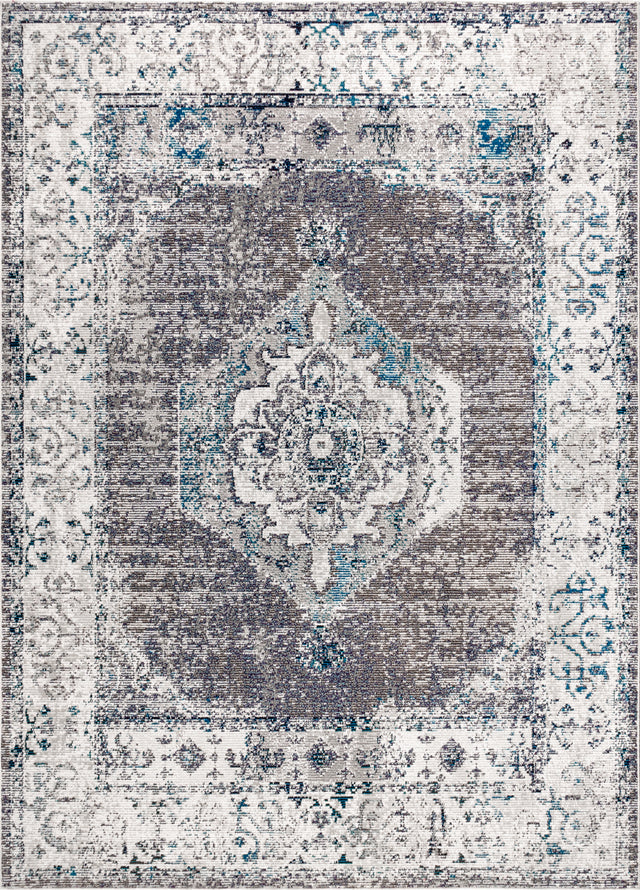 A modern gray and ivory color scheme updates this timeless medallion rug design.